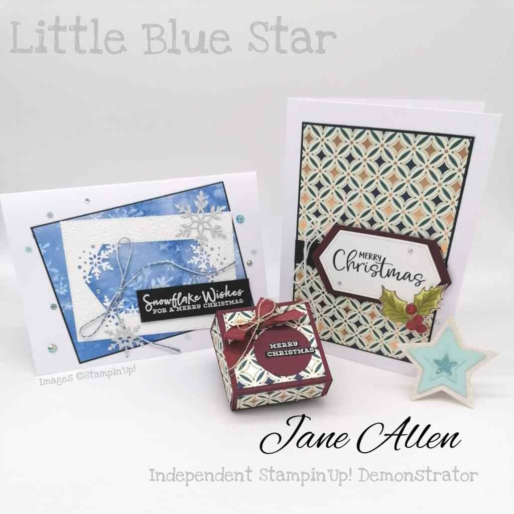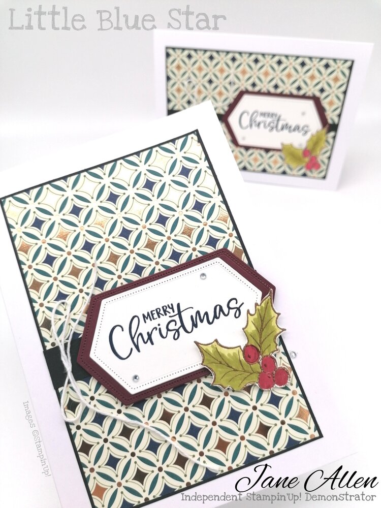 The second card is showcasing the gorgeous Brightly gleaming DSP, which just MAKES a card by itself! I added some stitched nested labels dies, and the sentiment from my Paper Pumpkin box Joy to the world. If you haven’t seen this box yet, I totally recommend you give it a look, as it is really lovely- I think the sentiments and the fonts are just perfect! You can order this, and any of the materials I used, for any of the projects, at my online store www.littlebluestar.stampinup.net
