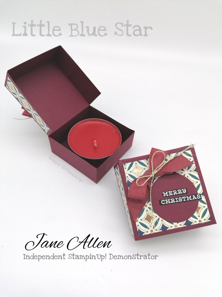 The last project was a gift box for a scented candle. I used Merry Merlot cardstock (as it was a mulled wine candle!), and Brightly gleaming DSP, to match the card. I used my Stampin blends to colour the ribbon- a good trick if you haven’t got the right colour to compliment your project. I then cut the little ‘Merry Christmas’ part from the sentiment from Snowflake Wishes, which I heat embossed in white.