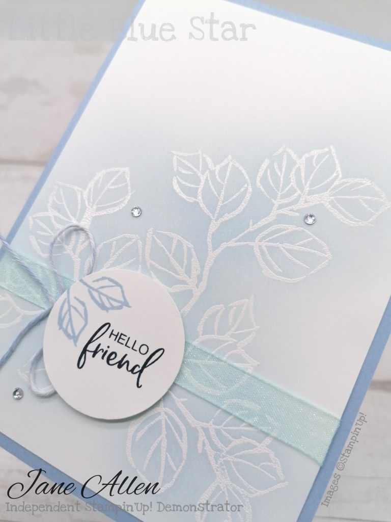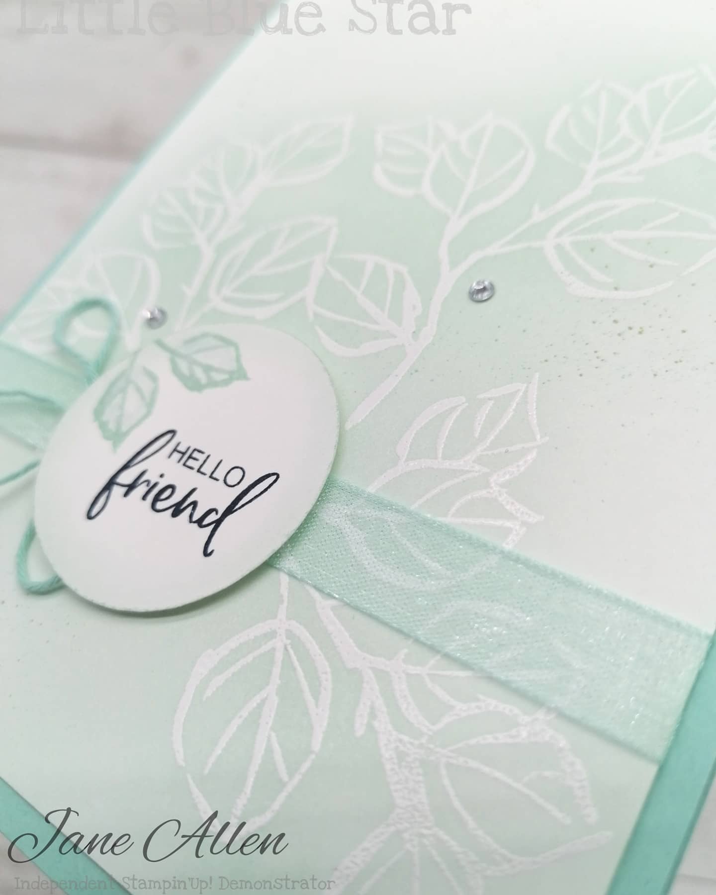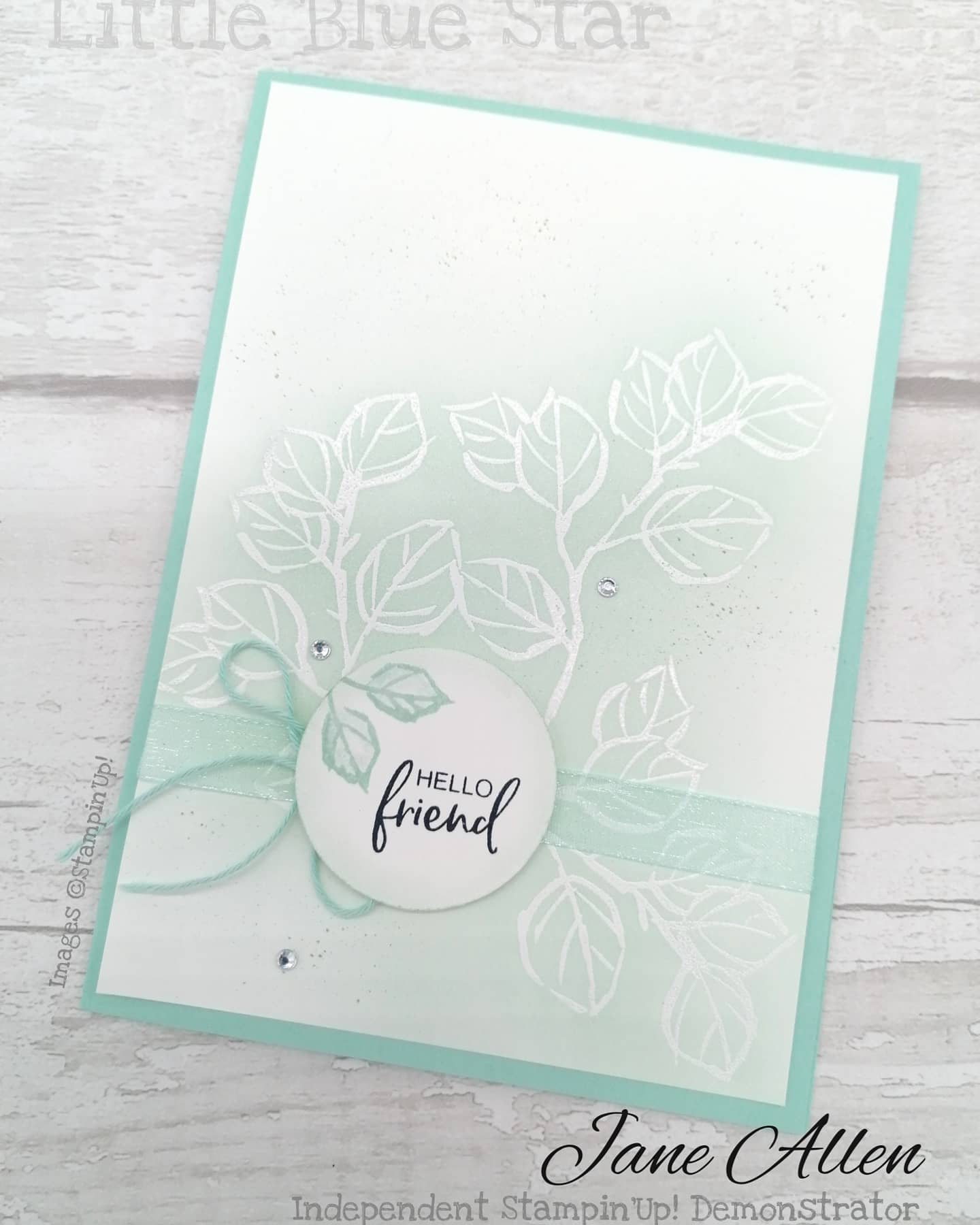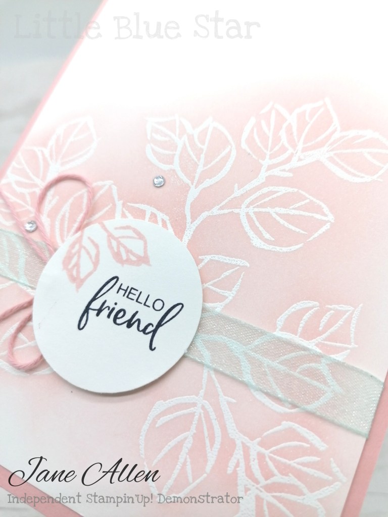 I stamped the ‘hello friend’ and punched out with my circle 1 1/2″ punch. I went around the edge with the blending brush, to give a little texture, and stamped a couple of the little leaves, which I coloured using my blender pen. Then I added some sheer pool party ribbon across the card, adhering to the back with my Stampin seal. Then I adhered the layer to my base card of Pool party. I added a bow from bakers twine, which I attached with a glue dot, and just a few rhinestones finished the card.