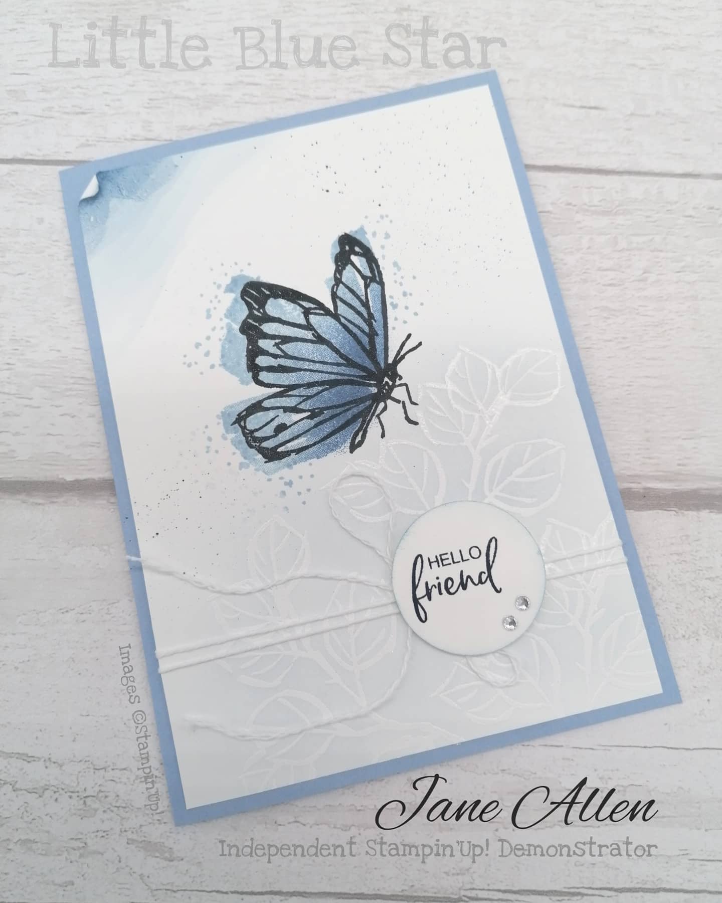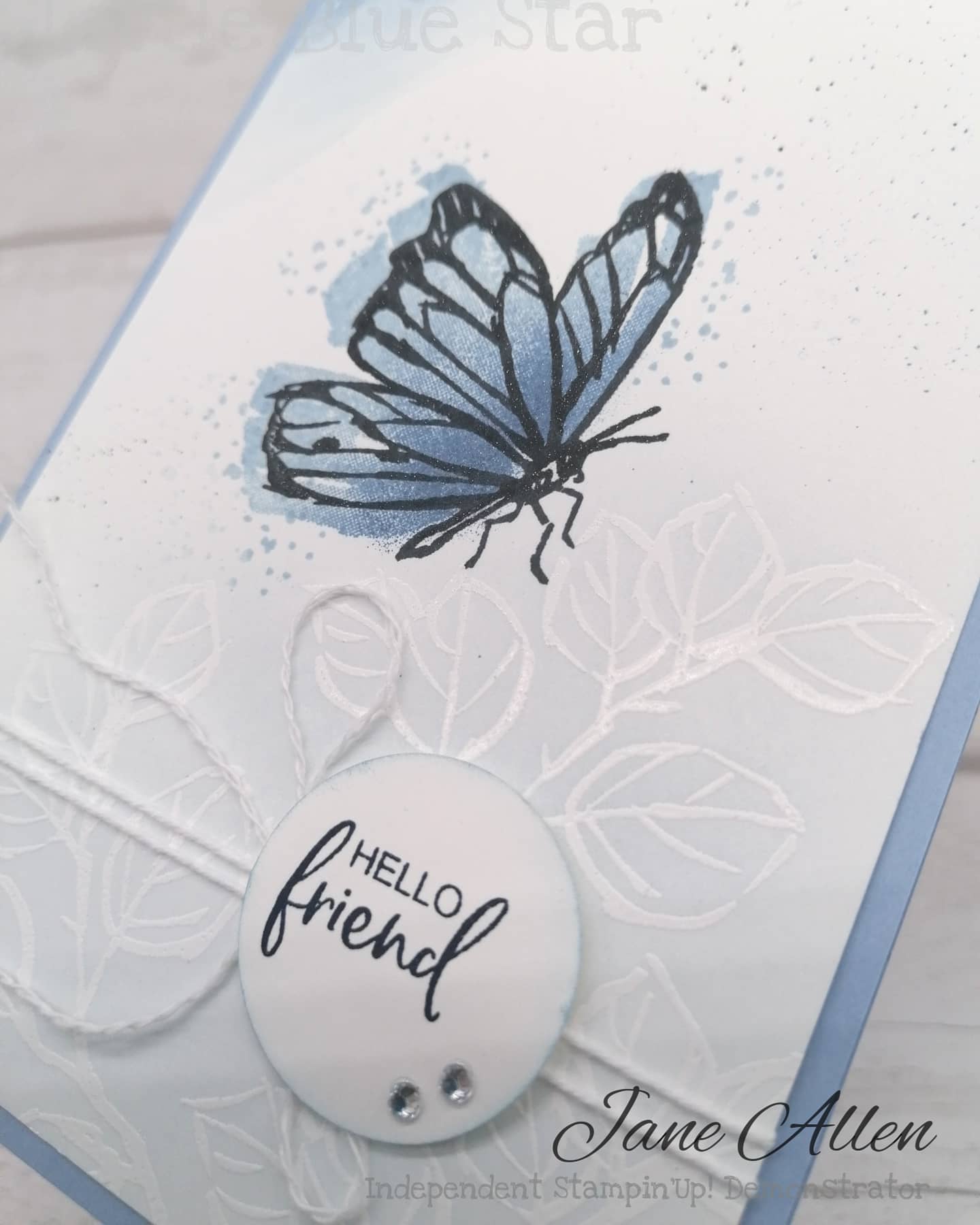 My final card I stepped up! Again, the butterfly was created the same way, but I also used my sponge dauber to add some Misty Moonlight ink just to the inner part of the wings- this gave a lovely depth of colour. I heat embossed with white the leaves a few times, and then used my blending brush to add some very soft colour, just enough to let the leaves show. Again, I added twine and popped up my sentiment on dimensionals, and added a bow. On the top left corner, I used my blending brush to add some colour, I used a scrap torn piece of paper to create a soft line across, and moved it slightly each time, so as to give ‘layers’ of colour. The very top I folded over, to give some added texture. I added some splatters with my Stampin write markers, and I also used some wink of Stella to give some sparkle to my butterfly.