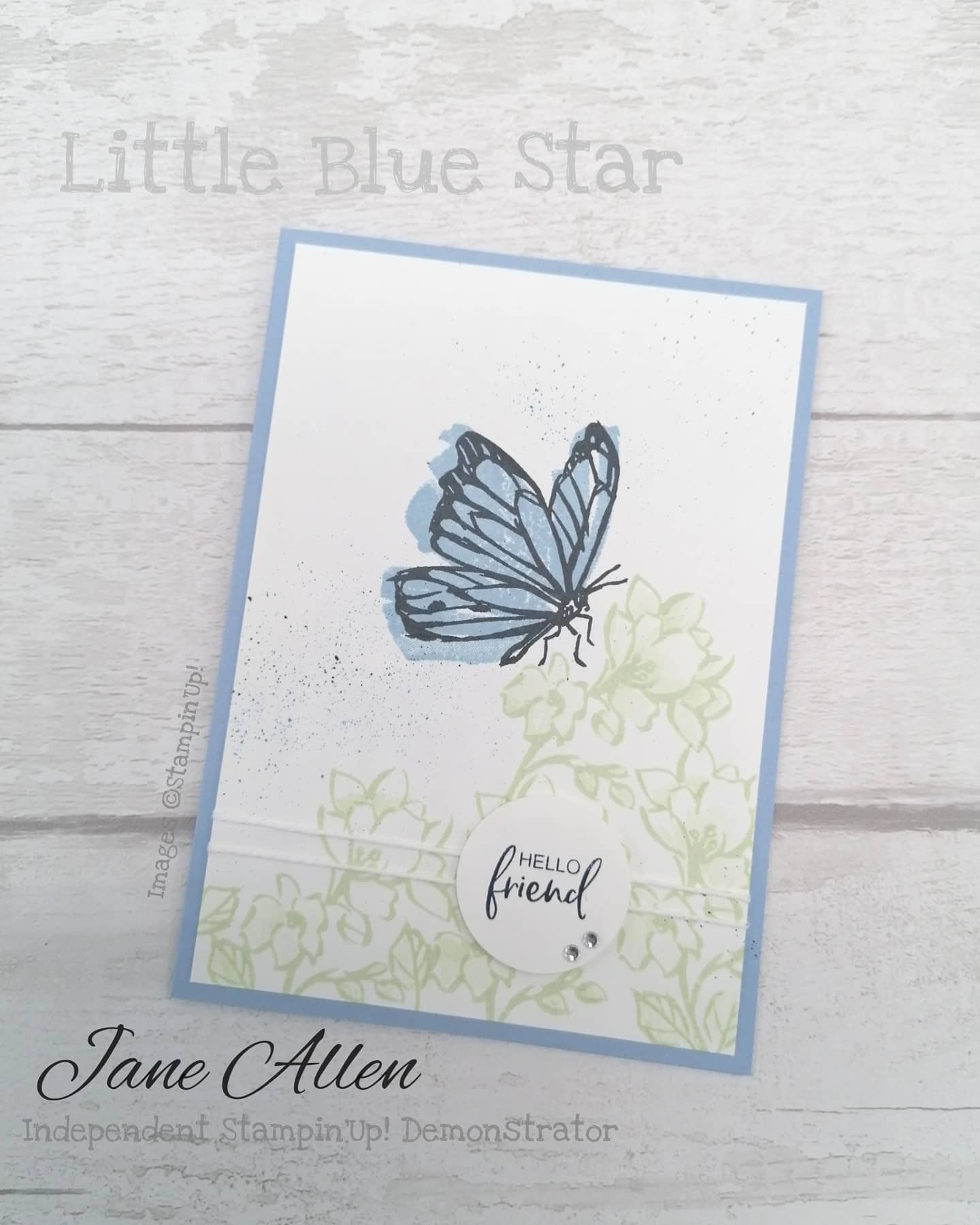 My first card was quite simple. I had a layer of white and stamped my butterfly in black. Then used the 2-step stamping technique to stamp Seaside Spray over the butterfly, to create a sort of watercolour look. It’s so easy using the two stamps, it makes it simple to create these effects. I did a little ink splatter with my Stampin write markers, and also used the little ‘dotty’ stamp to stamp some texture around my butterfly. I then stamped my sentiment ‘hello friend’, and attached my layer to my base of Seaside Spray.