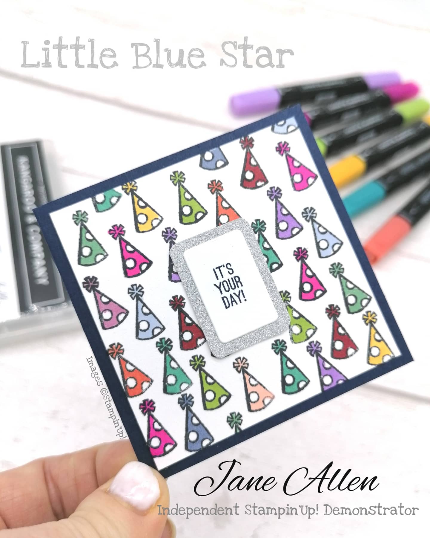 I made little 3×3″ cards, with a layer of basic white 2 3/4″ square. I repeat stamped the hat, and then coloured using my blends. So easy yet so effective! I then stamped my sentiment and cut out using the little die from the matching kangaroo dies, then hand cut a piece of silver glimmer, (once I’d stuck it on), just so it had a little border round.