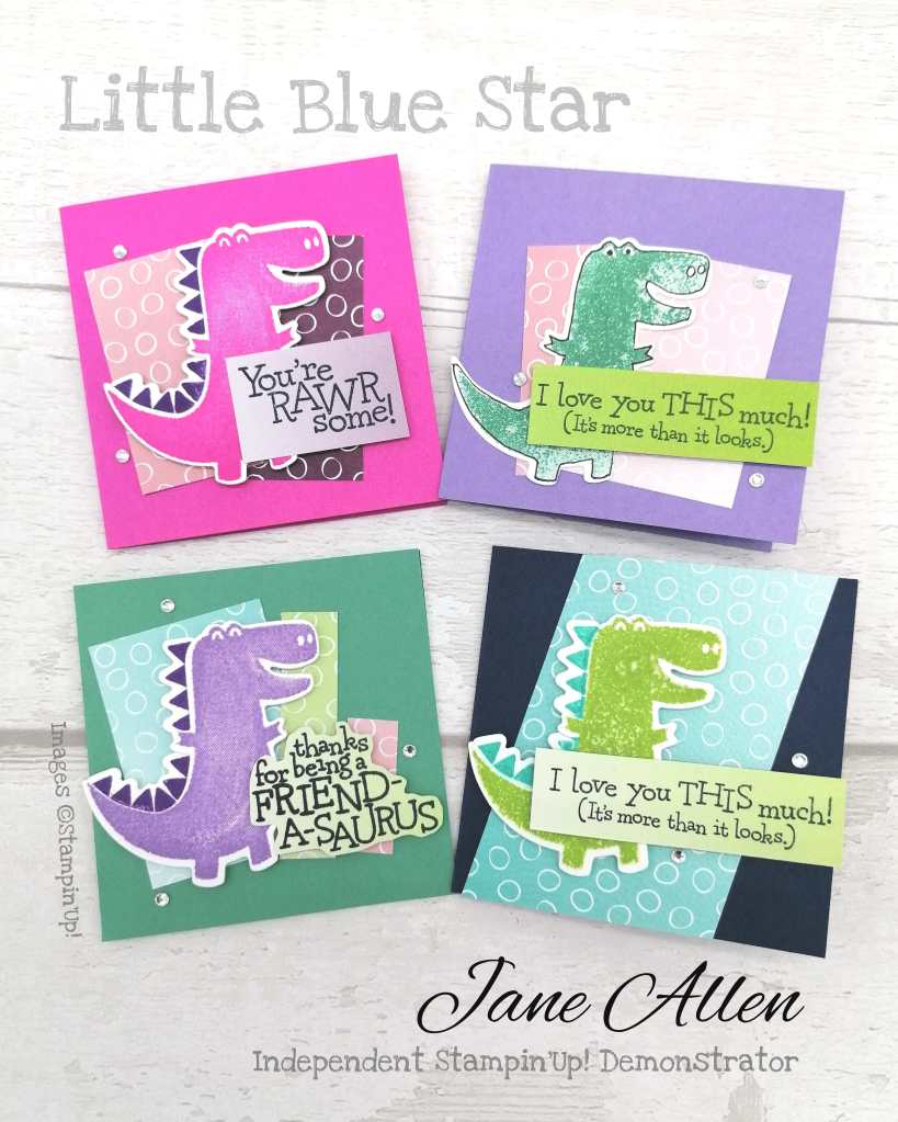 These cute 3×3″ cards were made with off cuts of DSP I had leftover on my desk! Then I used different sentiments from the set stamped on DSP. This little dinosaur is just the cutest thing!