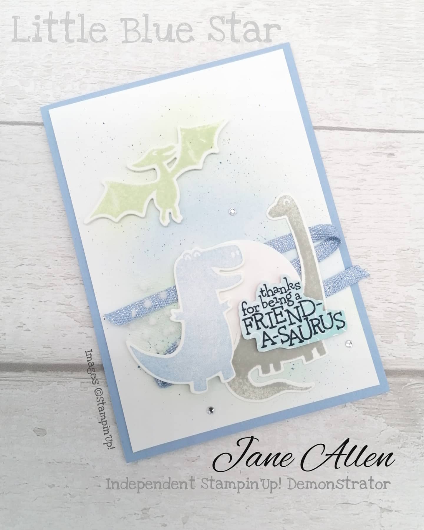 And the last card, well I just HAD to didn’t I?!! Seaside Spray 💙 The dinosaurs are stamped in Soft Seafoam, Smokey Slate, and of course Seaside Spray. I have used the blending brushes to create a soft background, using Seaside Spray, and Granny Apple Green. I used my blends to create some splatters! The ribbon is Seaside Spray metallic, and the polka dot tuille.