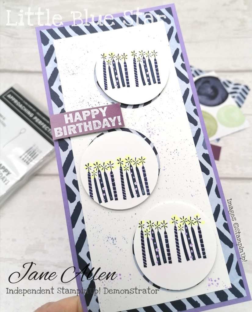 I started with a base of Highland Heather, and a background of the paper blooms DSP. Then a layer of basic white, which I punched 3 circles out using my 2″ punch. On each circle, I stamped the candles, and coloured using my blends. I then popped them up on dimensionals, at differing off-sets- meaning some you can see the bottom, another the side, and the other the top. I did some ink splatters using my blends over the basic white layer, and the sentiment I heat embossed with white onto some DSP.