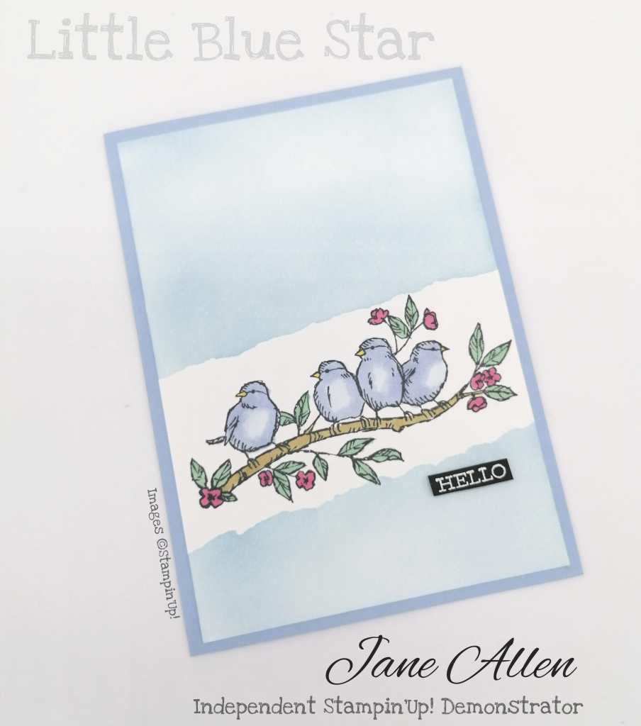 I had a layer of basic white, and then took a piece of card, and ripped the edges. Tape it down, use washi tape if you have it. Then take your blending brush and ink up the card either side of the masked piece. When you take away the card, you are left with a white ‘strip’ and you can then stamp an image. I chose the birds from Free as a bird stamp set, and coloured with my blends.