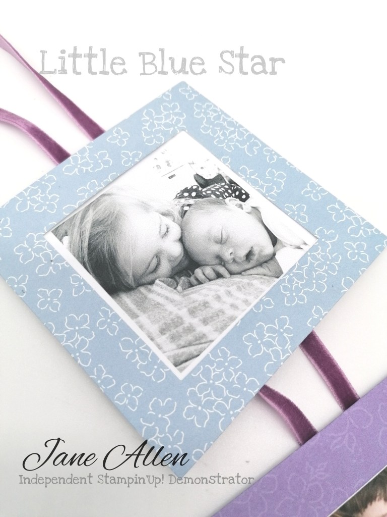 The next was a photo frame which I cased from my wonderful upline Liz. Start with three DSP 5×5″ pieces. Then 3 basic white 4×4″. Place the white on the DSP and cut out a square in the centre. I used the largest stitched shape die. Then turn over the DSP and glue the white ‘frame’ that you have. Then fold over the edges. Then using tear and tape on three sides, adhere a square 3 7/8″ leaving the top, so that’s where you will slide your photo in. Lay out all three frames and then adhere your ribbon to the back, making sure they are all pointing the right way so when you hang it, the gaps to pop your photos are at the top, and the ribbon loop is at the top. Finish by attaching the little square from earlier that you cut out, and adhere over the ribbon(to neaten). All done, ready to hang! Watch my YouTube tutorial