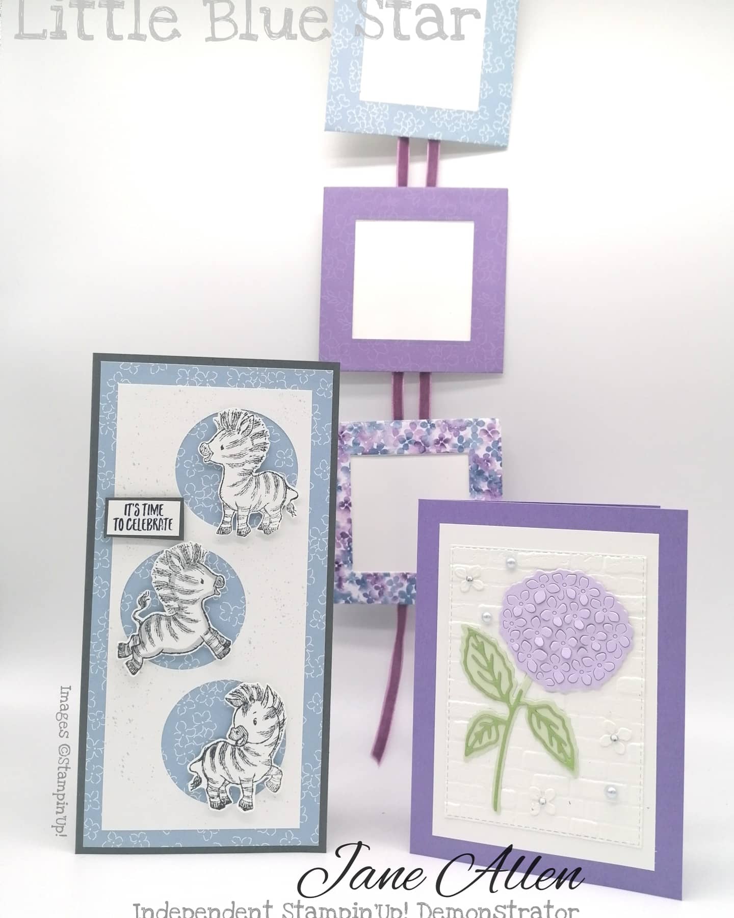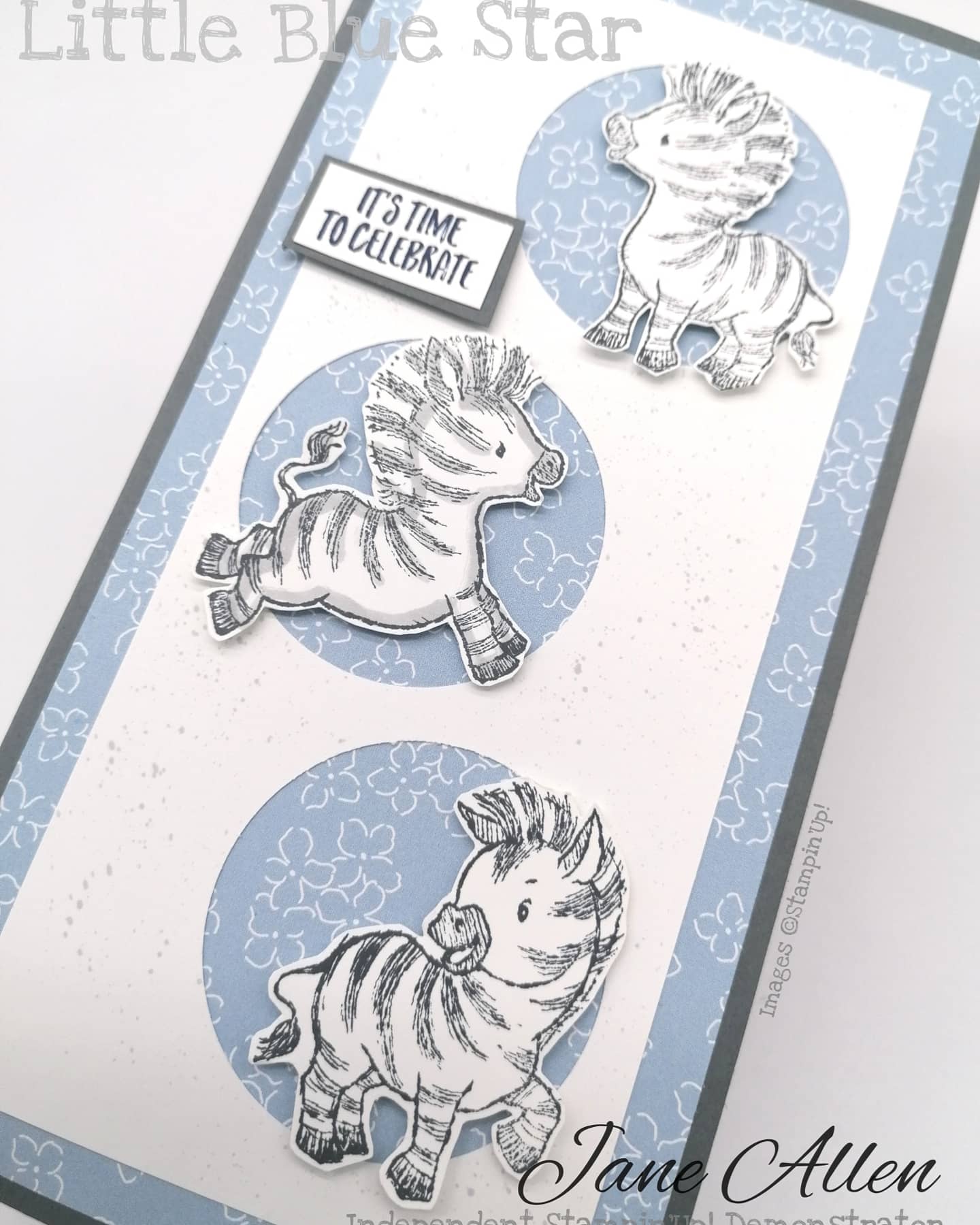 The second was a slimline card. A base of 8×8″, scored at 4″. I used basic grey. Then a layer of DSP- from the Hydrangea Hill DSP pack. 3 3/4×7 3/4″. Then a layer of basic white, 3 1/8×7 1/8″, which I punched 3 circles out using my 2″ circle punch. Also did a few ink flicks, using my grey blends. The set I used was ‘Zany Zebras’ and I fussy-cut out all three, popping up on dimensionals. The sentiment was from the same set. Watch my YouTube tutorial