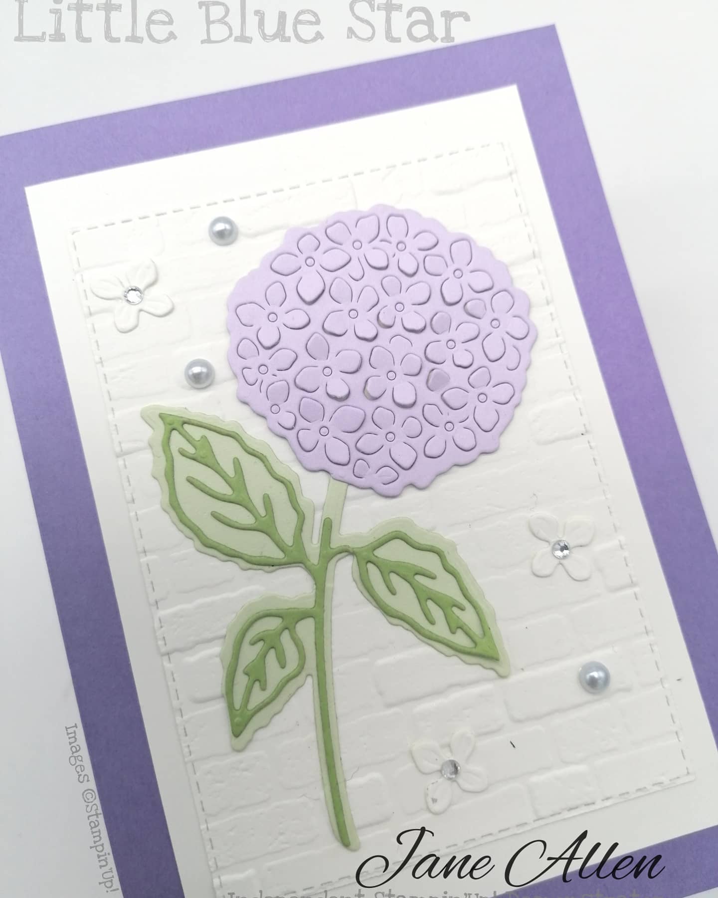 The first is a card I made using the hydrangea dies. The base card is Highland Heather, and then a layer of basic white. Then a layer cut with a rectangle stitched die, which I also used the 3D brick embossing folder on to give a bit of texture. I used the full hydrangea die as a base, in Soft Seafoam. Then the leaves, in pear pizzazz, which I also used the adhesive sheets, so to make it easier to adhere. The main flower head was cut from Purple Posy, and you can push out the petals to make it 3D. I also cut a few of the small flowers to adhere around the big one. A few rhinestones and Pastel pearls finished the card. I decided to leave my card with no sentiment, but of course my class attendees could if they wanted to, using what they had.Watch my YouTube tutorial