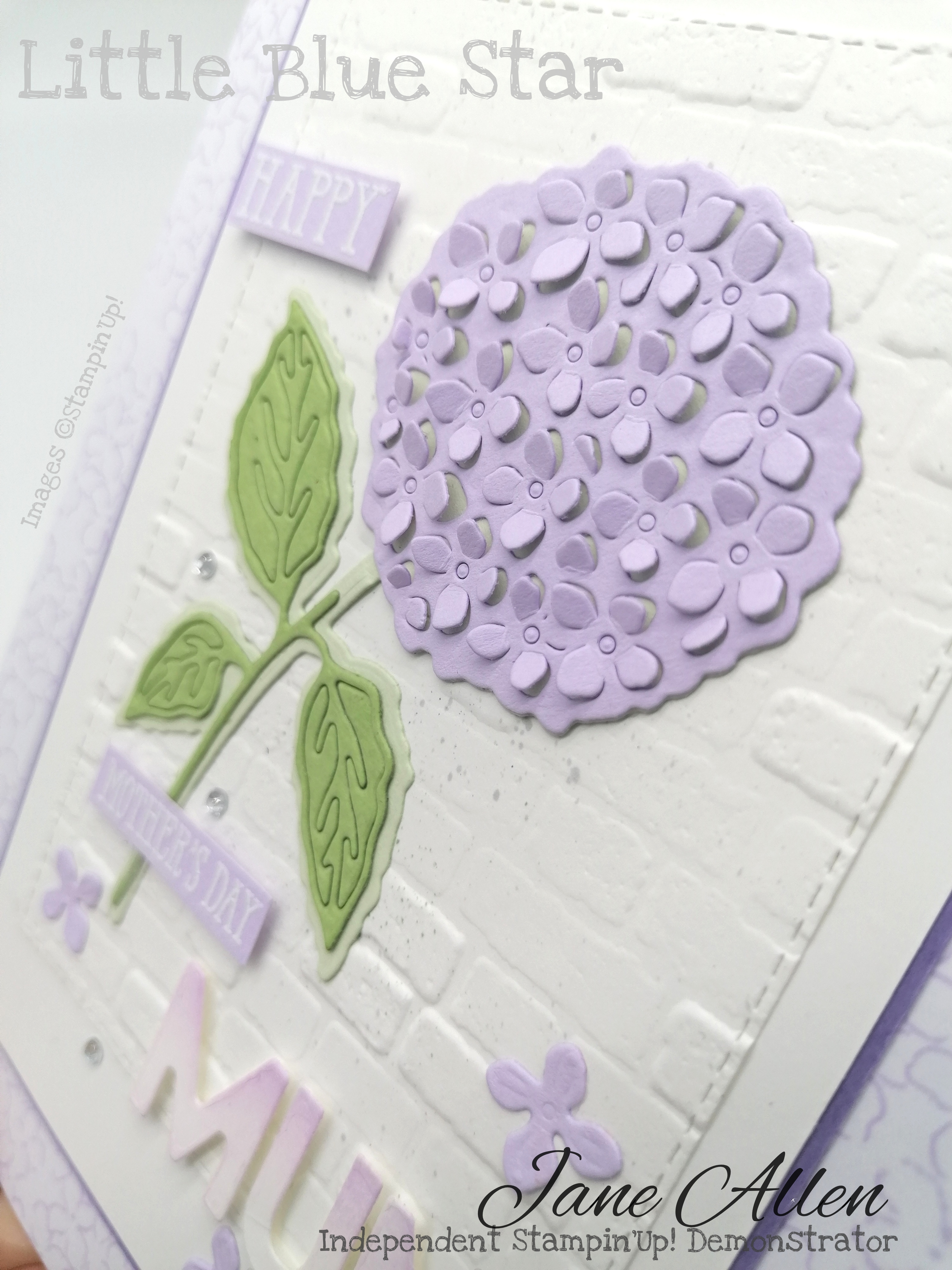 I had a base card of basic white, and stamped around the edge with the flower stamp from the Hydrangea Haven stamp set from Stampin’Up! I inked in Purple Posy, but you could use Highland Heather and stamp off for a paler tone.