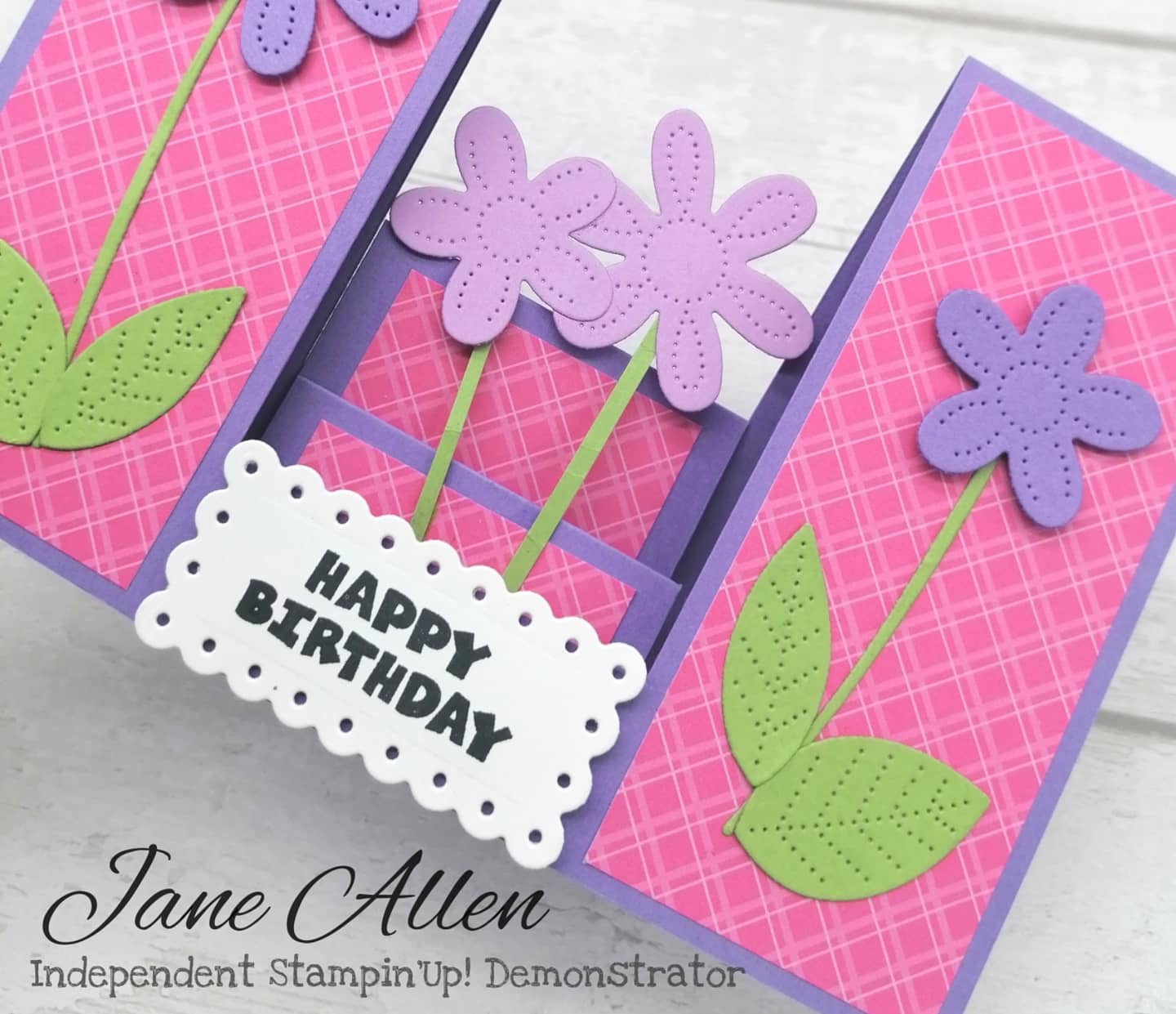 Turn to the long side and score at 1″,2″,3½”,7½” only between your two slits. Then score at 5″ all the way across the card. You then fold the card in half at the 5″ score line, and the scored pieces between your slits become the folded steps. They will fold like consertina style; mountain, valley, mountain, valley. The DSP needs to be cut to 4¾”x 2″. Please watch my YouTube video for details.