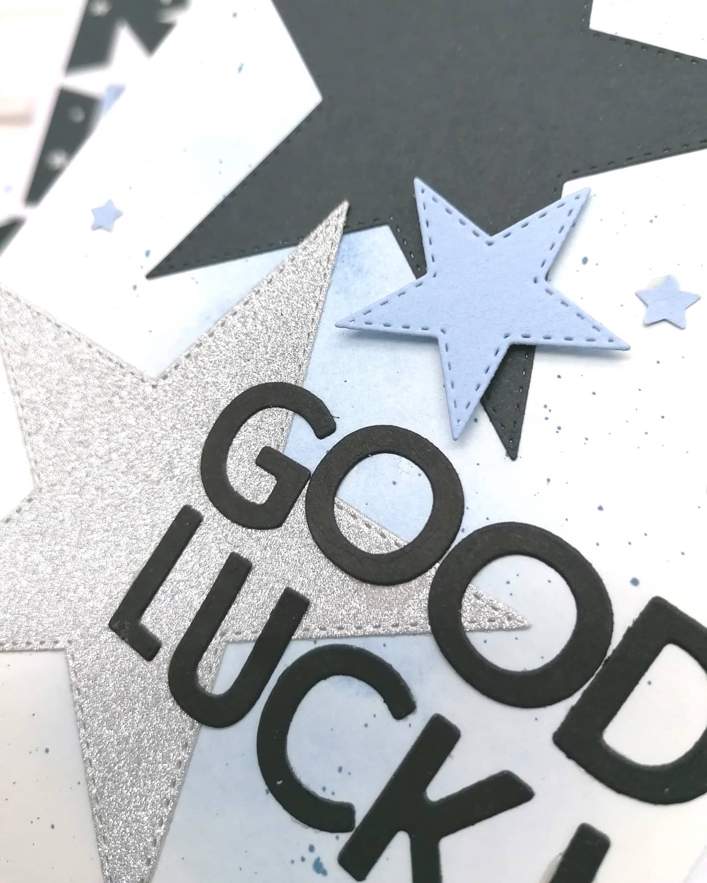 The top card, I used the negative space from the die cut letters, and adhered to a Seaside Spray piece cut from the scalloped contours dies. I also used the negative space from some black stars I’d cut, which I think links nicely to the lettering. A flash of silver just peeping out along the edge adds a simple shimmer. Again, a few small stars added and another cute card created!