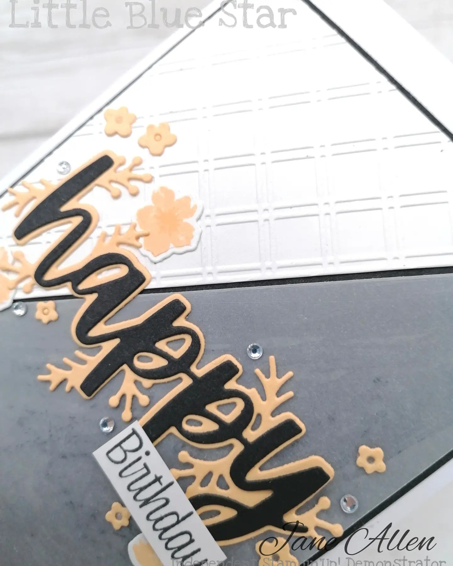 The second card I made with the leftover part of the embossed piece. Again, I used vellum on black as my background, but this time I left a tiny border between the two pieces. Then my happy dies were Pale Papaya, and black. I used my sweet as a peach stamp set and matching dies to give a more floral tone to this card. My sentiment is from the same set, and I just snipped the happy birthday in two, just using the birthday part. Finished with a few rhinestones and it’s a simple card made with the leftovers from another!