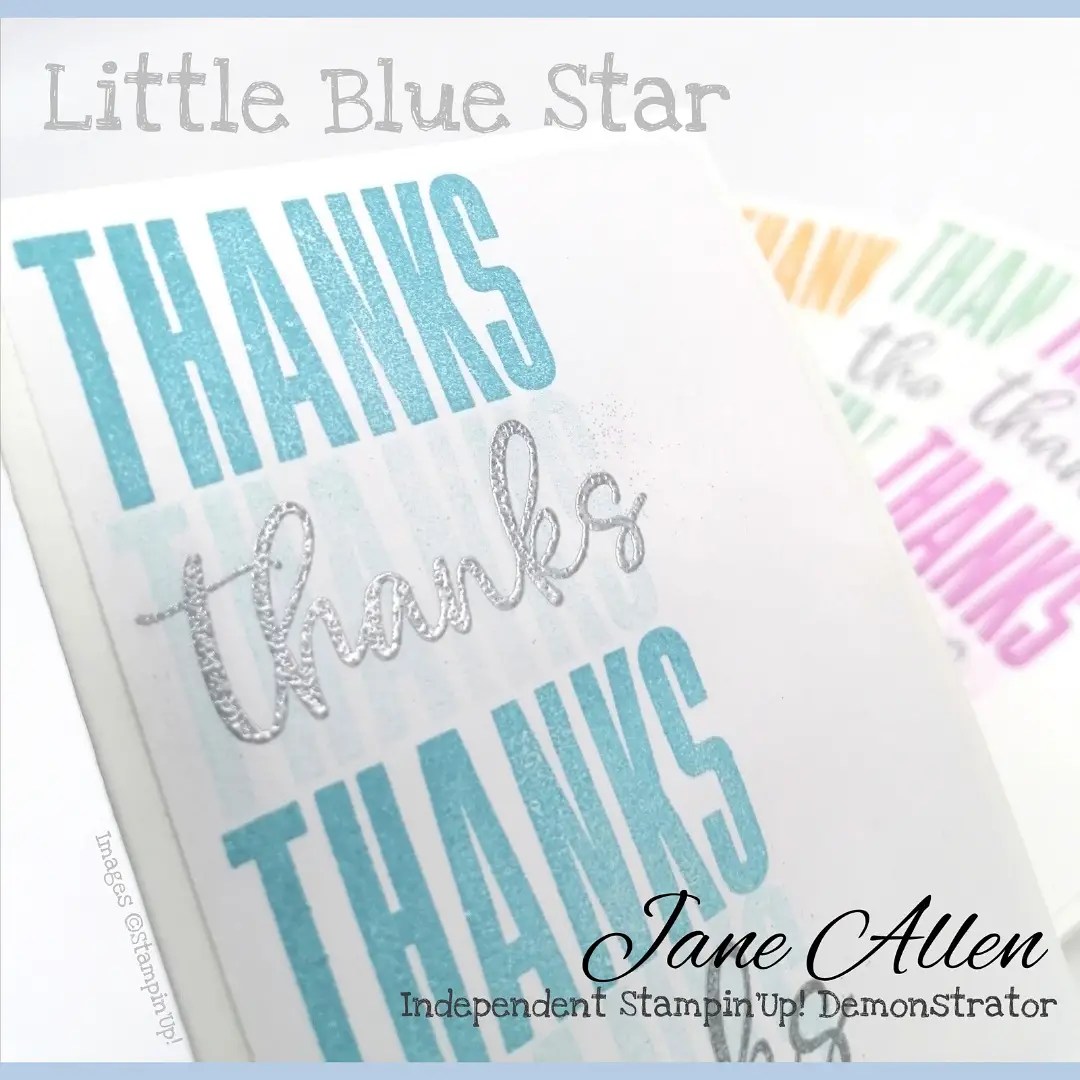 Once I’d stamped the big ‘thanks’ all down the card, I then got the smaller, more handwritten-style ‘thanks’ and I heat embossed with silver. This I did in the gaps; the area which I had stamped second generation, so was the paler colour.