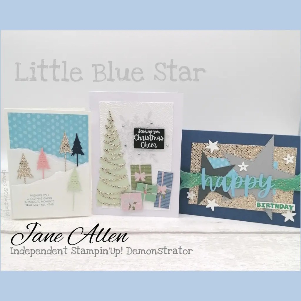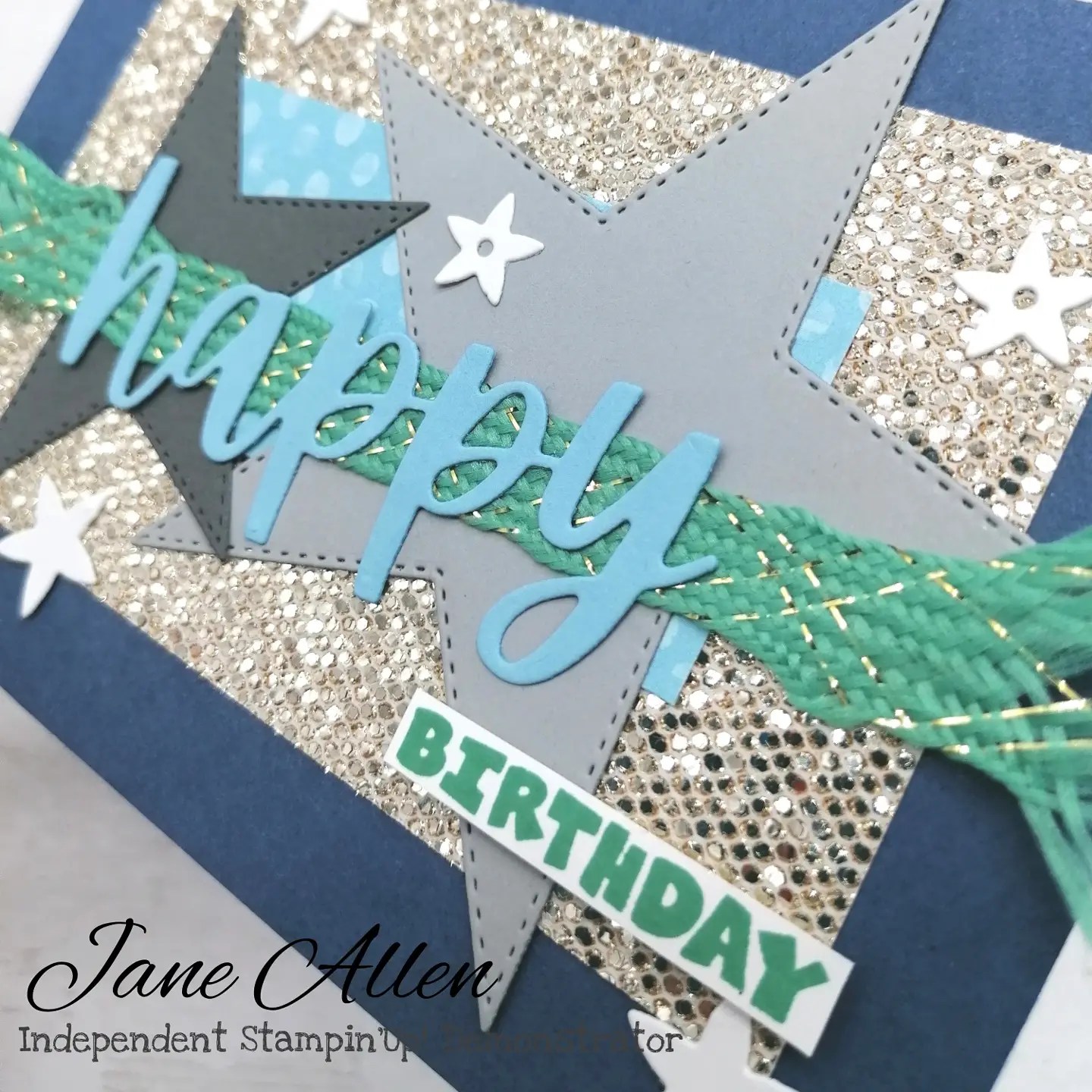 The last card is a base of misty moonlight, then a layer of dazzling paper (just love this!) Then a little sweet as a peach DSP peeking through behind some stitched stars, one in basic grey and a larger one in Smokey slate. I then added some ribbon (just jade and gold) which I gently prized apart to make it wider! On top I added ‘happy’ in balmy blue, then the sentiment in just jade, from a grand kid, and I just snipped the birthday part to use. To finish, a few white stars from the Christmas cheer dies.