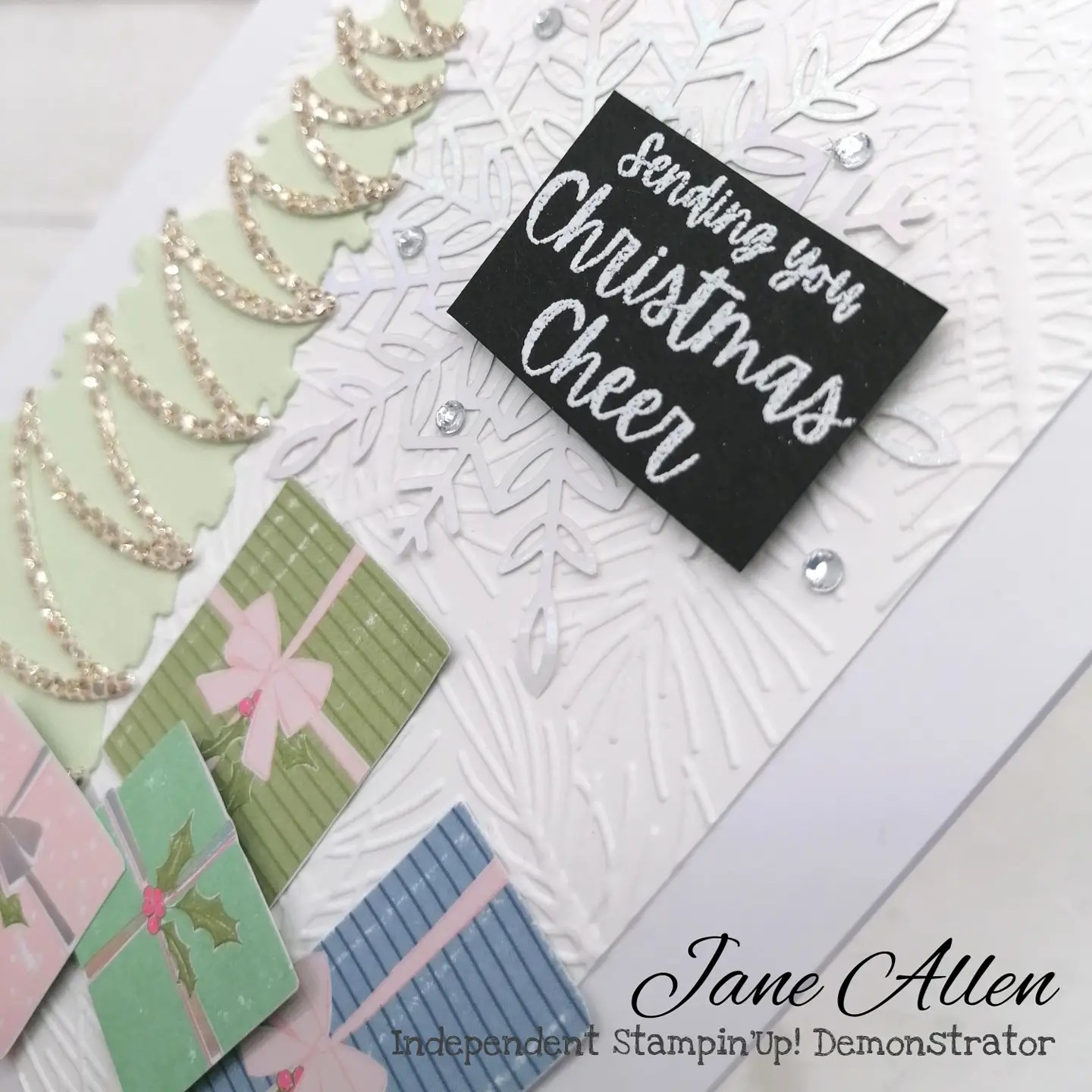 The second card is a base of white, then a layer of white which I embossed with the wintery 3d folder in the pine. I used the largest tree from the Christmas tree dies, in soft seafoam, then the zigzag tinsel which I cut from the dazzling paper which is a freebie during sale-a-bration. The parcels are fussy-cut from a piece of whimsy and wonder DSP, some glued on flat, and some popped up on dimensionals. I added one of the wonderful snowflakes, and on top I added the sentiment, which I heat embossed with white onto black. I really love this card- so sparkly and Christmassy!