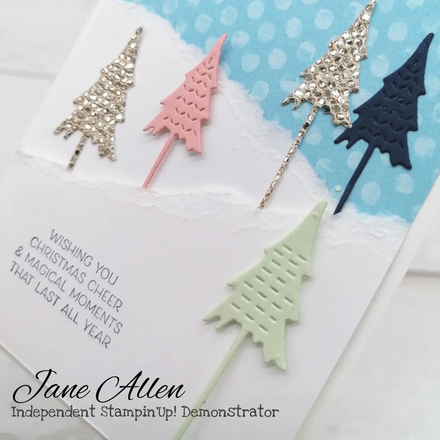 Then I took some trees dies and cut out in a variety of colours; Pool Party, blushing bride and night of navy. I also cut two from the gorgeous dazzling paper (which is a freebie during sale-a-bration- only til the end of this month and whilst stocks last) . I placed the trees at different levels, popping some up on dimensionals. The sentiment I stamped straight onto the white, and it’s from the whimsical trees set.