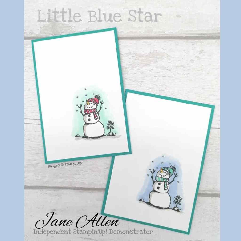 I started with a base of Bermuda bay (my eldest son’s fave!), then a layer of white. I stamped the snowman in memento black, then coloured using my blends.
