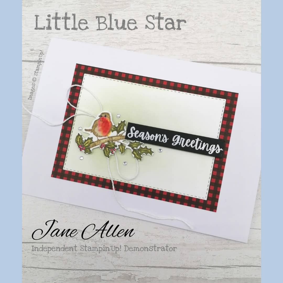 Hi everyone! I wanted to make a Christmas card with a robin, so I grabbed my ‘free as a bird’ stamp set, and stamped the group of birds in crumb cake. I then used my blends to colour the first bird in robin colours. I also used my thin black pen to change the leaves to holly leaves and colour his beak, and also highlight his eye. Then I fussy-cut around.