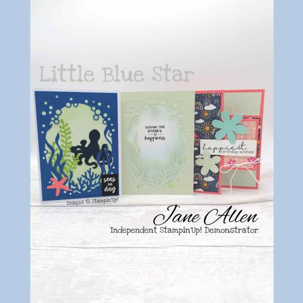 The first card is using the new bundle ‘Seas the day’ and I die cut the frame, octopus, starfish and seaweed. I put a soft seafoam piece of cardstock behind (3¾x5ā ”) the frame (3ā x5½), onto my base card in white. On the soft seafoam I flicked some ink from my stampin’write marker. This gives some texture to the card. The sentiment I heat embossed with white onto black, which is something I love as it gives such a crisp image. You can watch my YouTube tutorial Here