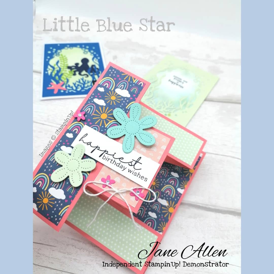 Then the folding! So the first fold goes back, the last one goes forward. This makes the basic ‘Z’ fold. Then the middle sections- the middle section has two score lines which need to fold out, then in. This creates a sort of ‘mountain’ and ‘valley’. Then the top and bottom section will be the same as each other, but will be opposite to the middle section you just did. It really sounds complicated when saying it! But it’s really not, and hopefully once you have a go you will see! Once they are all folded, fold it flat- which is how it will be folded to fit into the envelope- and burnish to crisp it all up. Then you can decorate with DSP. I used a Freebie from sale-a-bration, Sunshine and rainbows.